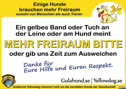 Was steckt dahinter? Hunde brauchen manchmal ihren Freiraum, weil sie krank, sehr alt, ängstlich oder läufig sind. Der Hund kann sich auch einfach gerade im Training befinden. Solche Hunde kennzeichnet man, für andere Hundehalter gut sichtbar, mit etwas Gelben wie ein Band oder Tuch, am besten befestigt man es an der Leine oder am Brustgeschirr. Trifft man beim Spaziergang auf in dieser Weise markierte Hunde, sollte man sich respektvoll verhalten, den eigenen Hund anleinen und, wenn möglich, ausweichen. Die Halter „gelber“ Hunde werden es Ihnen danken.